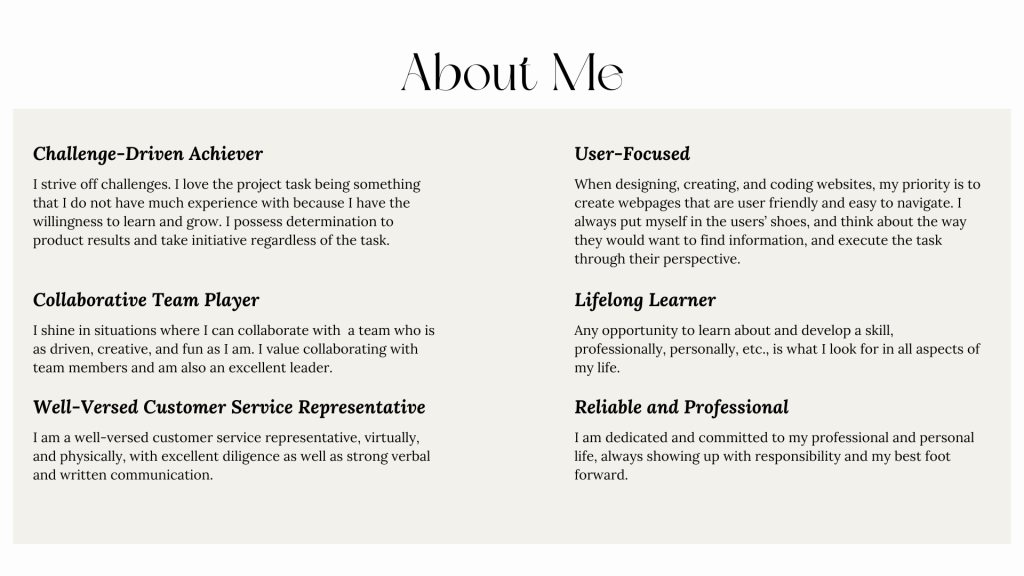 I specialize in freelance web development, graphic design, and social media marketing. I have HTML and CSS practical skills, and am experienced in Wix and WordPress platforms. Reach out to me if you are looking for someone to take care of your online presence! I am always open to taking on new projects!